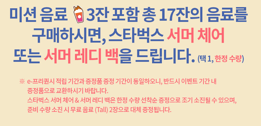 일단 스타벅스 음료를 총 17잔 먹어야 합니다.