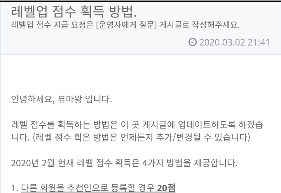 "글수 + 조회수"를 올릴 수 있는 레벨업 점수를 획득 할 수있습니다.