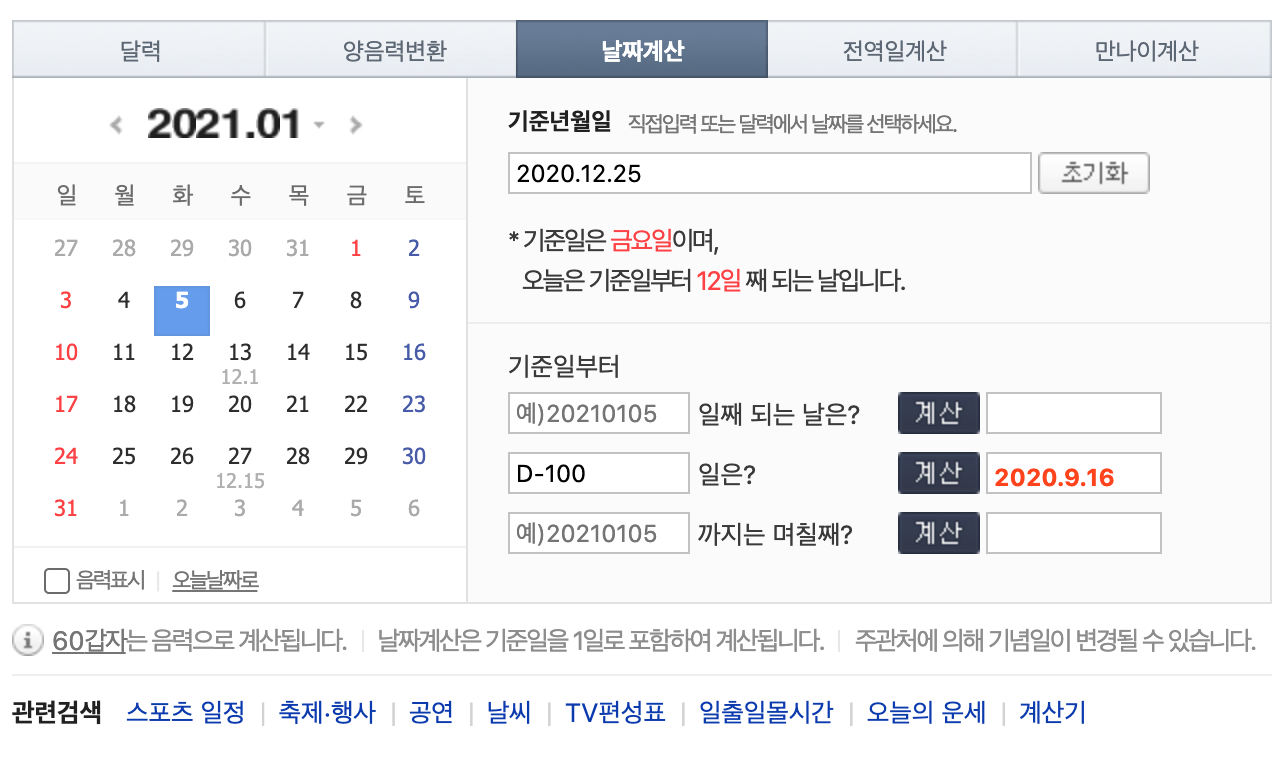 기념일 및 디데이 날짜 계산하기 (네이버 날짜 계산기)