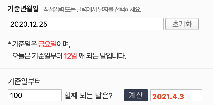 두번째 D-[ 빈칸] 부분에 100을 입력하고 계산버튼을 누르면