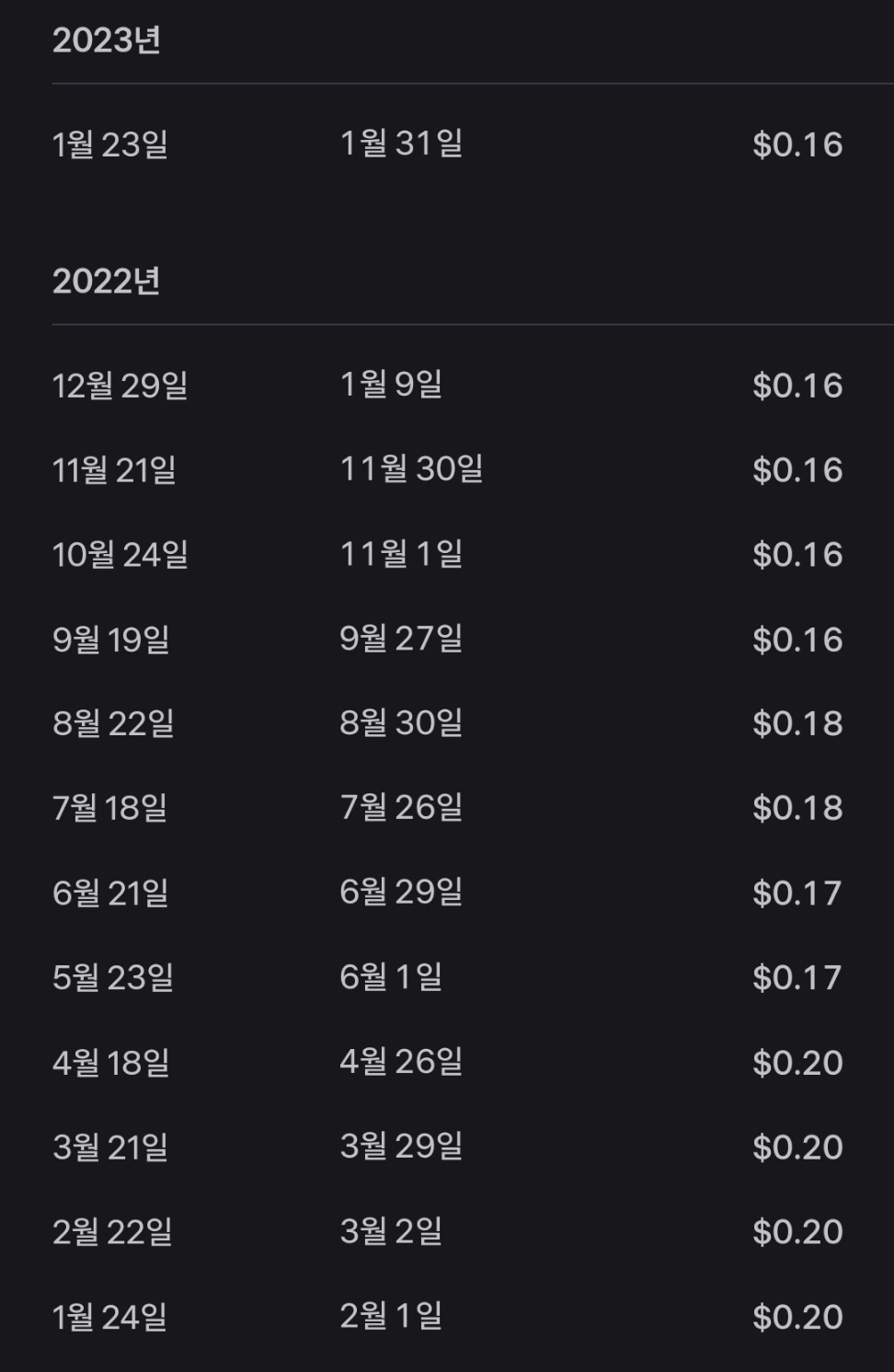 현재 주가대비해서 배당은 12.6%로 배당금이 연 2.15달러정도이다.