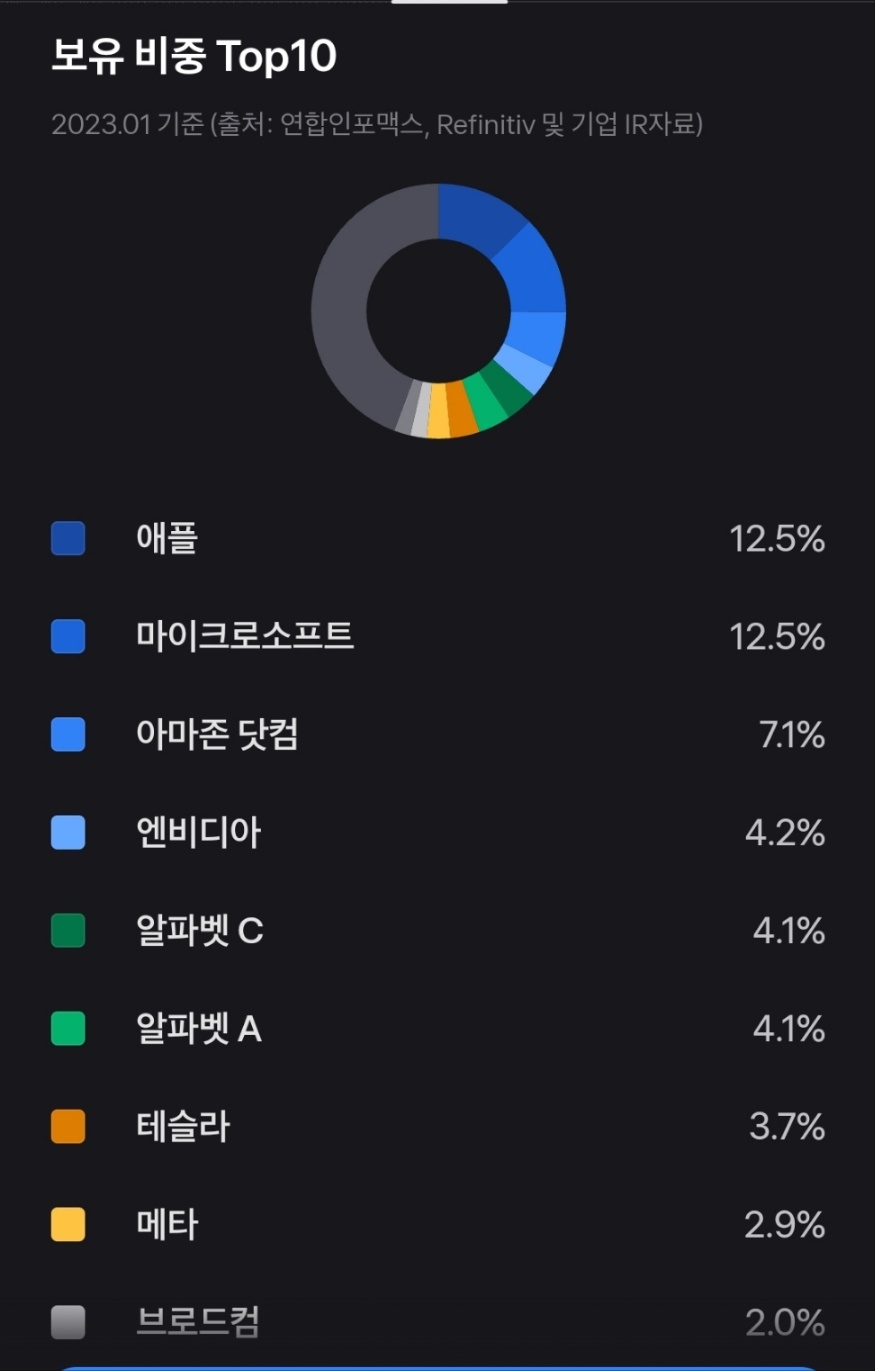 그뒤에 엔비디아 구글, 테슬라 등을 보유하고 있다.