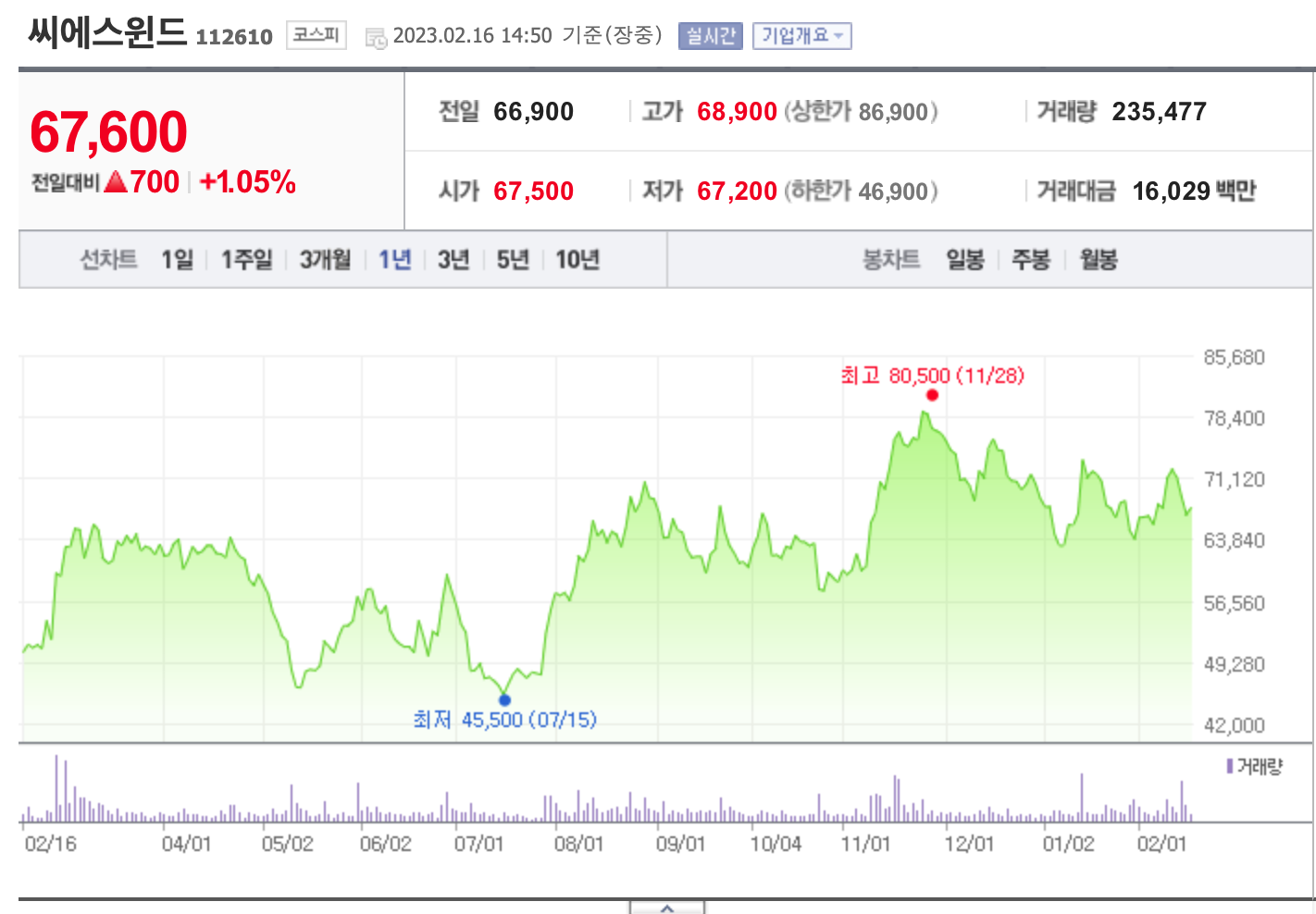 씨에스윈드는 해상풍력 관련주로 이전 바이든 정책 관련주로도 이슈가 많이되어 20년도 7천원이었던 주가가 10만원까지 가기도 했습니다.